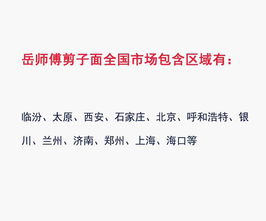 岳師傅剪子面幾十年來立足山西市場,不斷開拓省內(nèi)外市場,以極具知名度的品牌形象,以眾人點(diǎn)贊的產(chǎn)品口味贏得了廣大消費(fèi)者的喜愛,目前全國190多家店...
